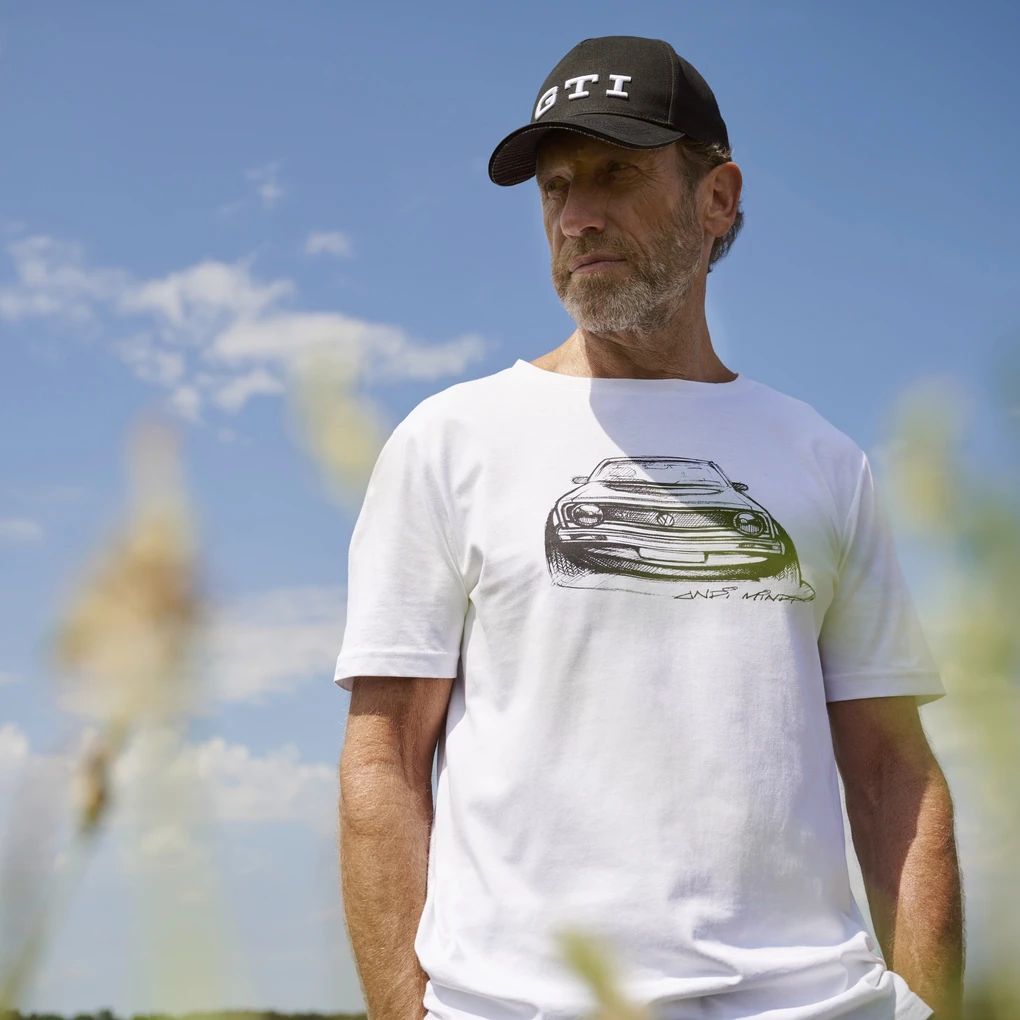 * Prednja strana otisnuta dizajnerskom skicom Golfa 1 GTI glavnog Volkswagenovog dizajnera Andija Mindta