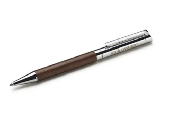 Reklamno sredstvo kemijska olovka od kromiranog metala s drškom u optici plemenitog drva. Volkswagen natpis laserski je utisnut na kromirani dio.